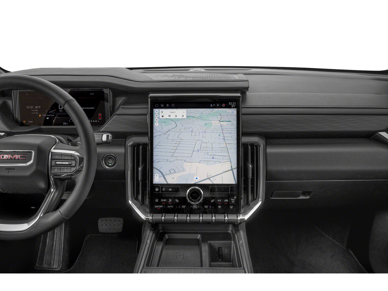 - 15" diagonal Premium GMC Infotainment System with high contrast display, with Google built-in compatibility, including navigation capability, color touch-screen, multi-touch display, connected apps, personalized profiles for each driver's settings, Natural Voice Recognition and Phone Integration for Wireless Apple CarPlay/Wireless Android Auto for compatible phones