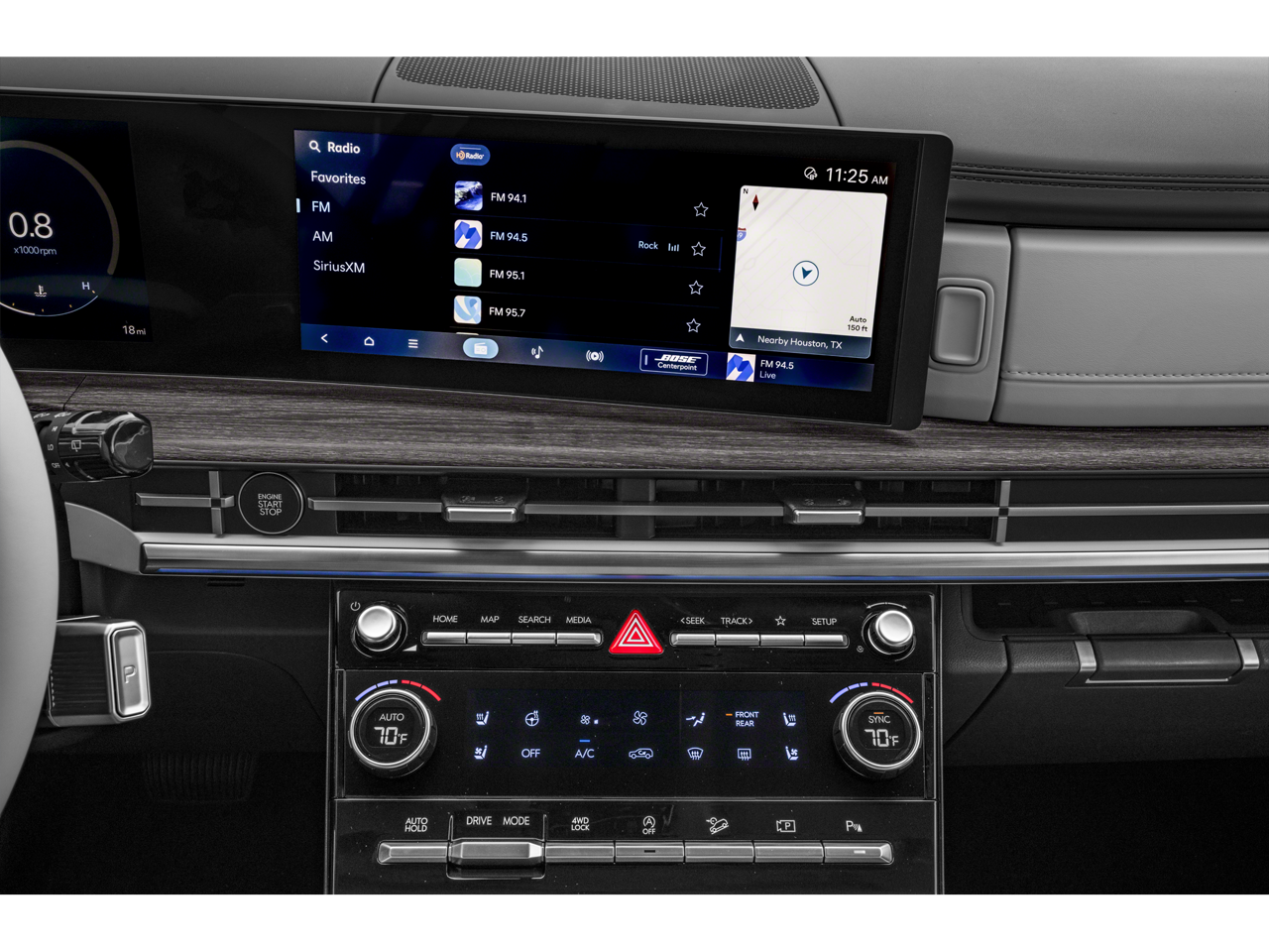- Radio: AM/FM/HD Bose Premium Audio System -inc: 12 speakers including subwoofer, external amplifier, 12.3" wide touchscreen, Apple CarPlay and Android Auto, Bluetooth® hands-free w/wireless audio streaming, dynamic voice recognition, USB connectivity, SiriusXM, Blue Link+ connected car system, navigation system including traffic flow w/incident data via HD Radio (HERE) and rear seat quiet mode